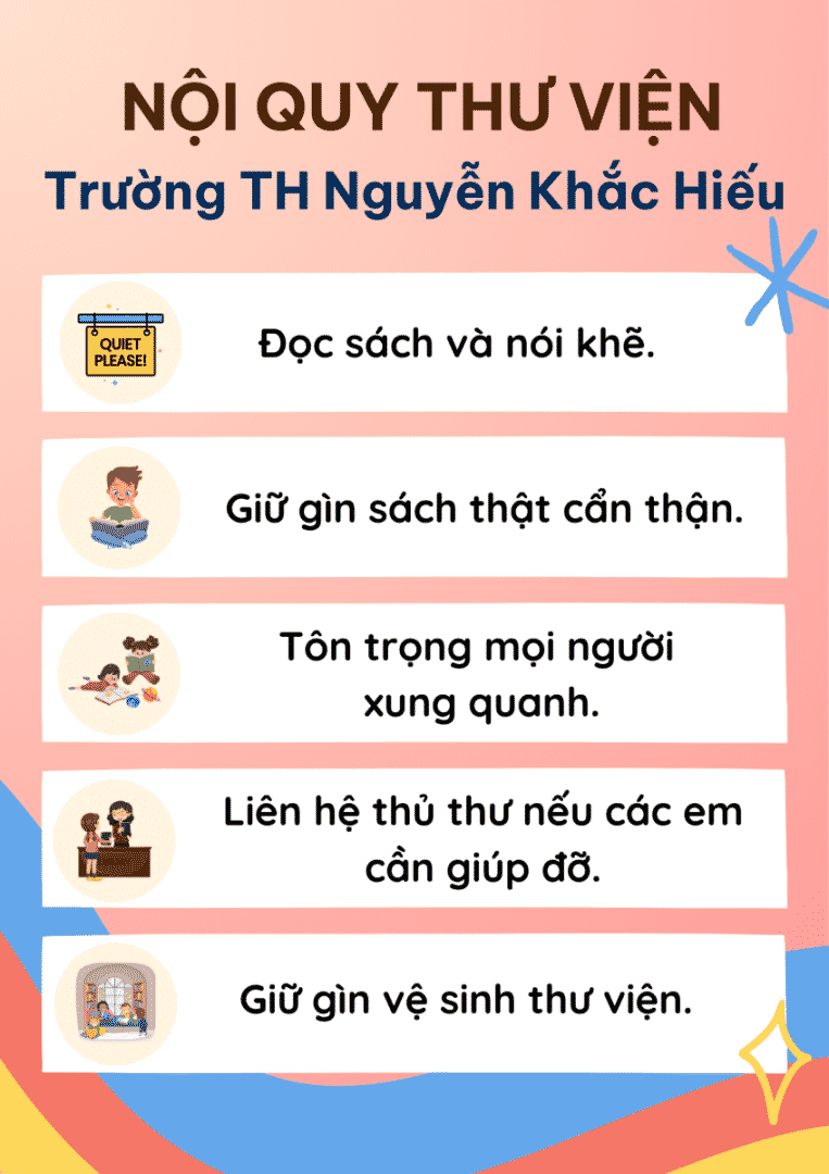 Trong thư viện của trường Tiểu học, mỗi học sinh đều phải giữ cho không gian yên tĩnh, tôn trọng sách và mọi người xung quanh. Việc trả sách đúng hạn và tình thần tự học là vô cùng quan trọng. Các em học sinh sẽ được hòa mình vào thế giới của tri thức, nơi nảy mình giữa những trang sách màu hồng và xanh, mang theo mùi của giấy in và cây viết mới mỗi khi bước chân vào.